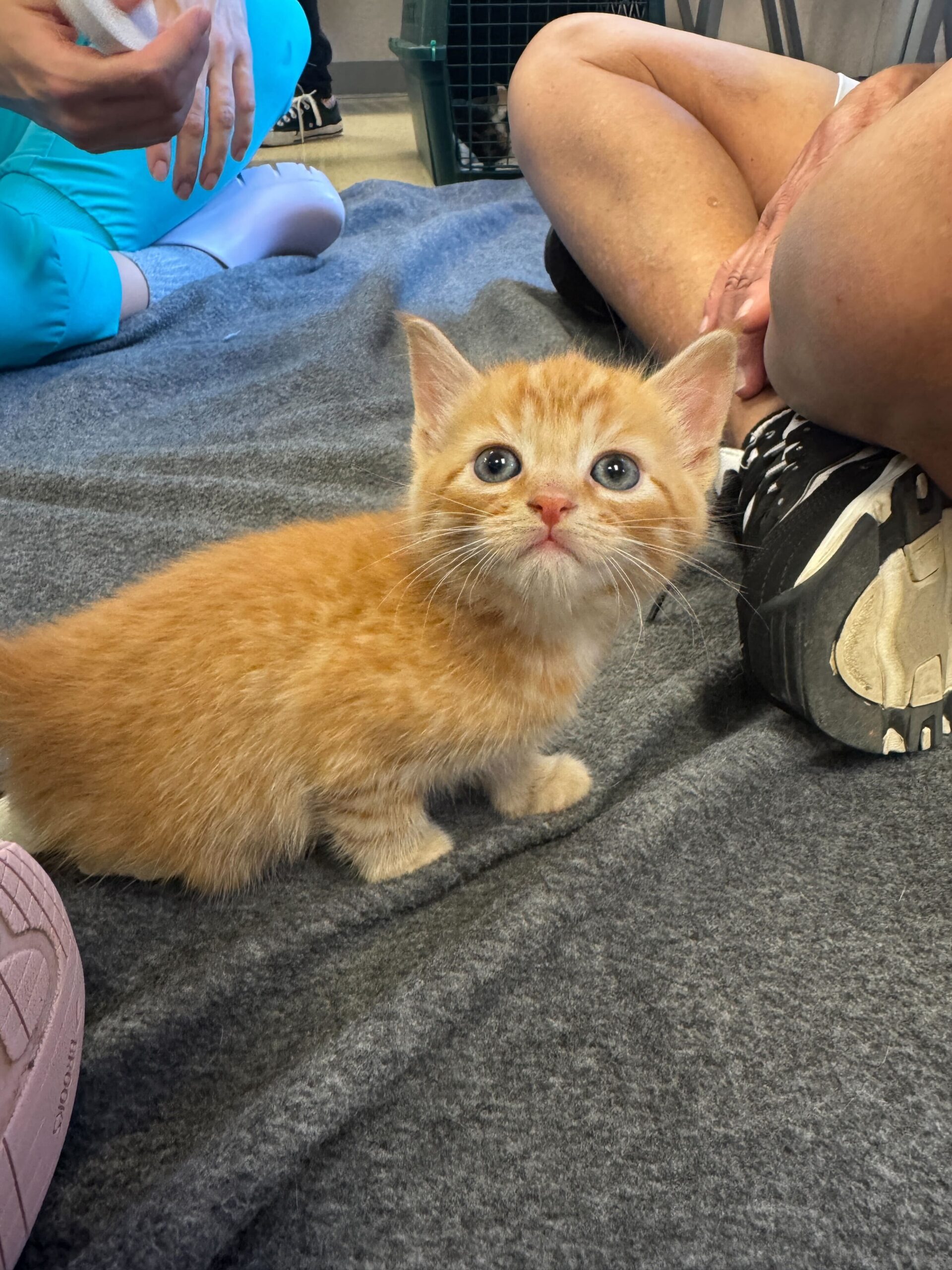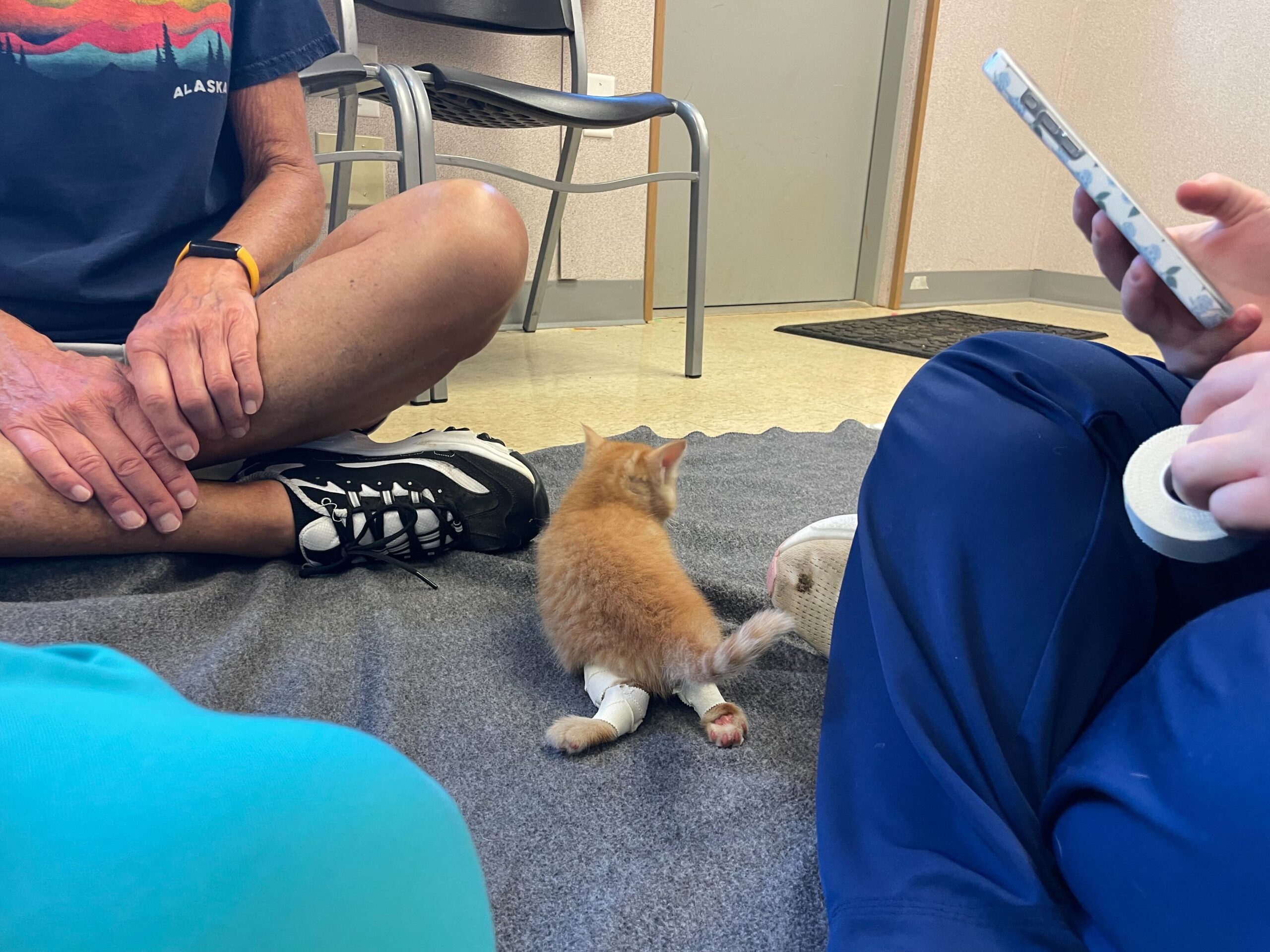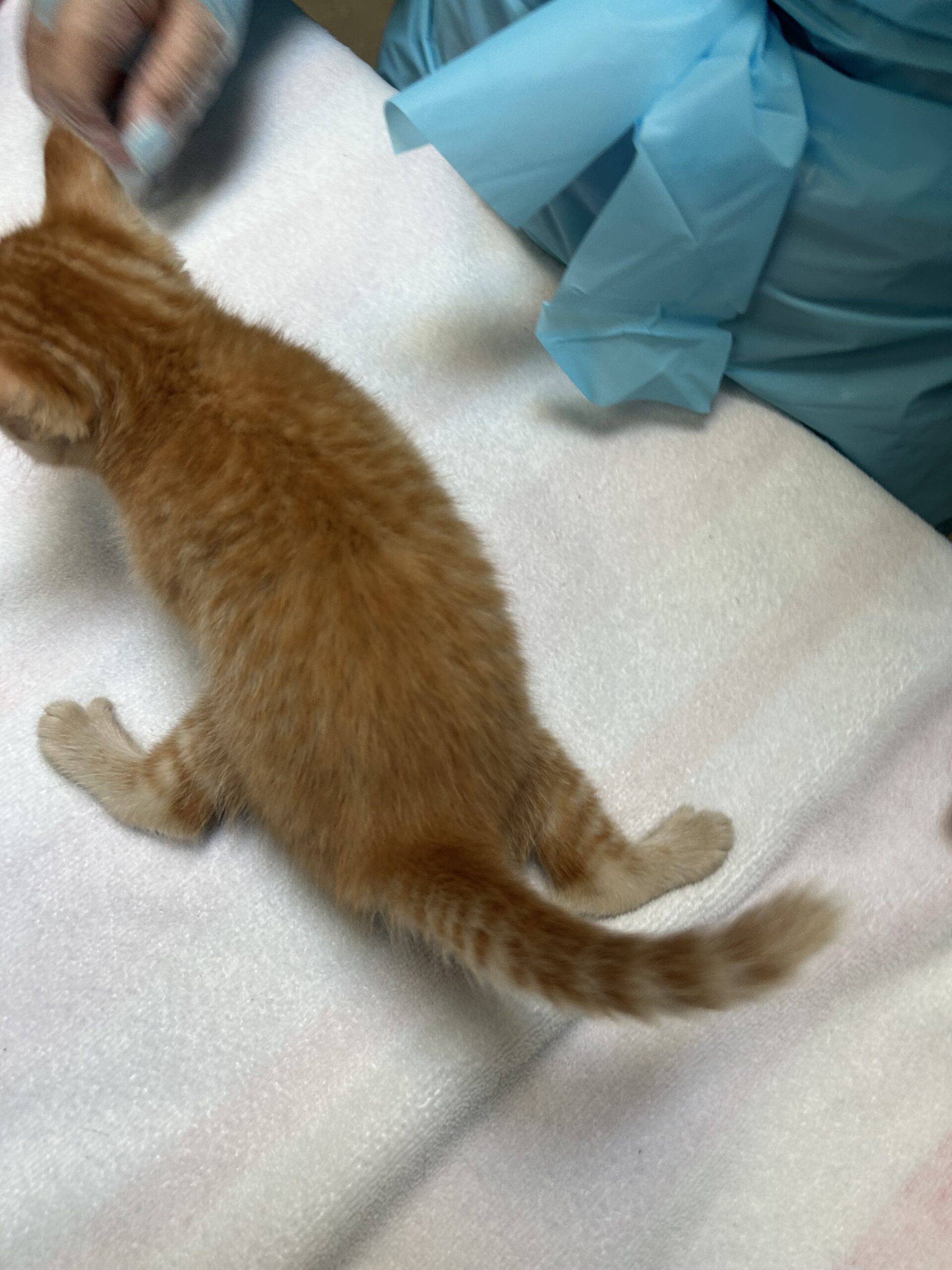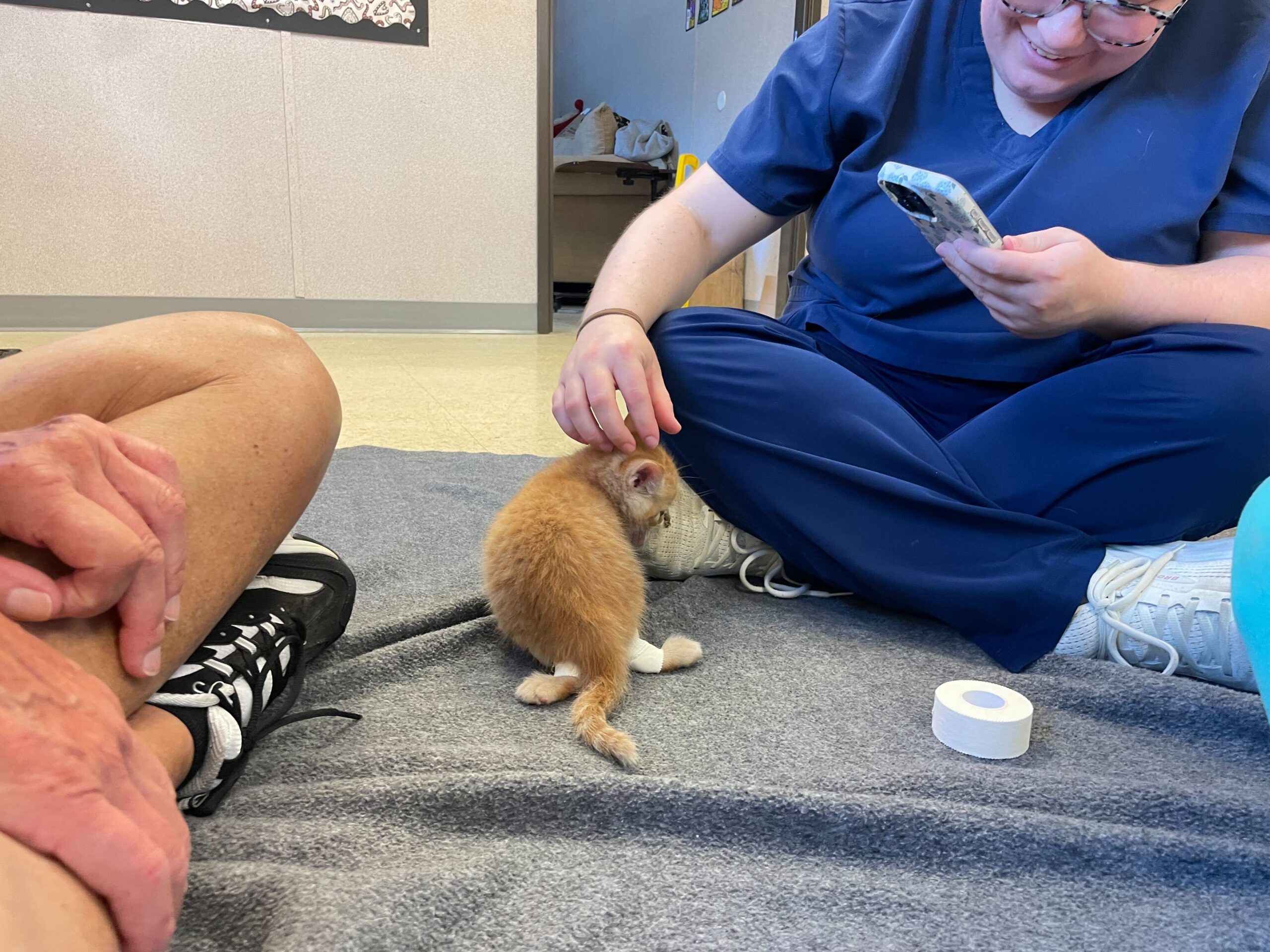 The tiny orange fluffball had something called Swimmer Syndrome, a condition that causes a kitten’s legs to splay out to the sides, making it hard for them to stand or walk. Without help, kittens like Phelps can struggle to grow strong enough to move normally or keep up with their siblings.