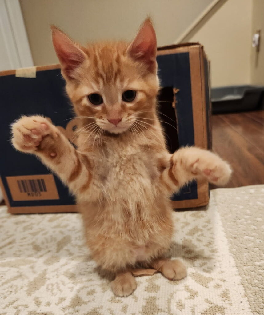 Today, Phelps is thriving — a fluffy orange blur of energy and enthusiasm! He can now run, climb, and even zip up and down the stairs with his brothers and sisters. He may have started life with a few extra challenges, but his determination (and a little help from his foster family) have made him unstoppable.