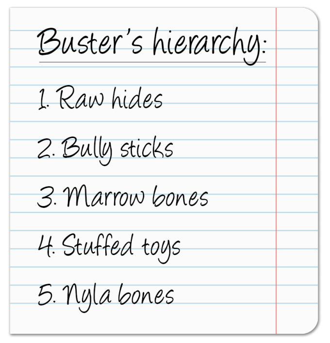 Remember that list you made of the resources your dog tends to guard? Here’s where we will rank these items in a hierarchy of “most valued” to “least valued”.