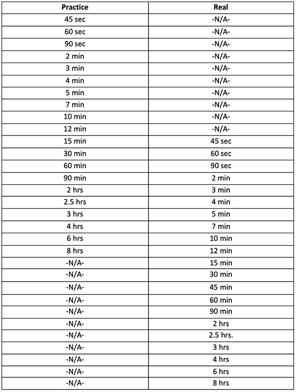 The following chart illustrates, in terms of time, an example of incorporating Practice Separations with Real Separations (see table below).
